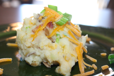 Next, coarsely mash the potatoes. Chop your chives, but reserve about 1 chive worth for the top of the dish when ready to be served. Add chives and butter to the potato mixture.
