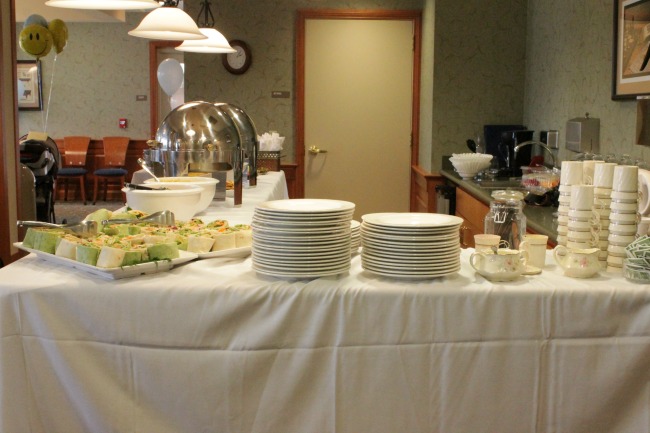 The buffet consisted of wraps, strawberry spinach salad, pasta salad, crab dip, spinach dip, fruit, and chocolate covered strawberries. We also had punch, the typical refreshments (water, coffee, tea, etc.), and some wine. One of our family members summed it up with delectable! I love that word, because everything really did taste amazing!