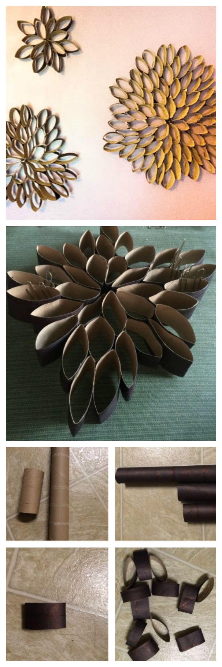 We are always looking for ways to reuse items in our home now that we are living are more minimalist lifestyle. I have always wanted some kind of decoration in our bedroom, above the head board. Those wrought iron art pieces look very classy, but tend to be pretty expensive. I had some left over paper towel and toilet paper rolls, so I decided to mess around and see if I could make my own art piece. Another way we reused toilet paper rolls was to make this toilet paper roll bird feeder.