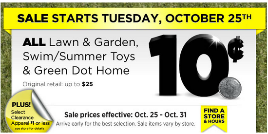 Dollar General $0.10 Sale! October 26, 2011 by Steph Leave a Comment Dollar General is currently having their $0.10 on already reduced summer products! As always, you may want to call first to make sure!