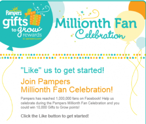 Pampers is having a Millionth Fan Celebration on Facebook, and they’re offering up 10,000 Pampers Gifts to Grow Points to the winner!