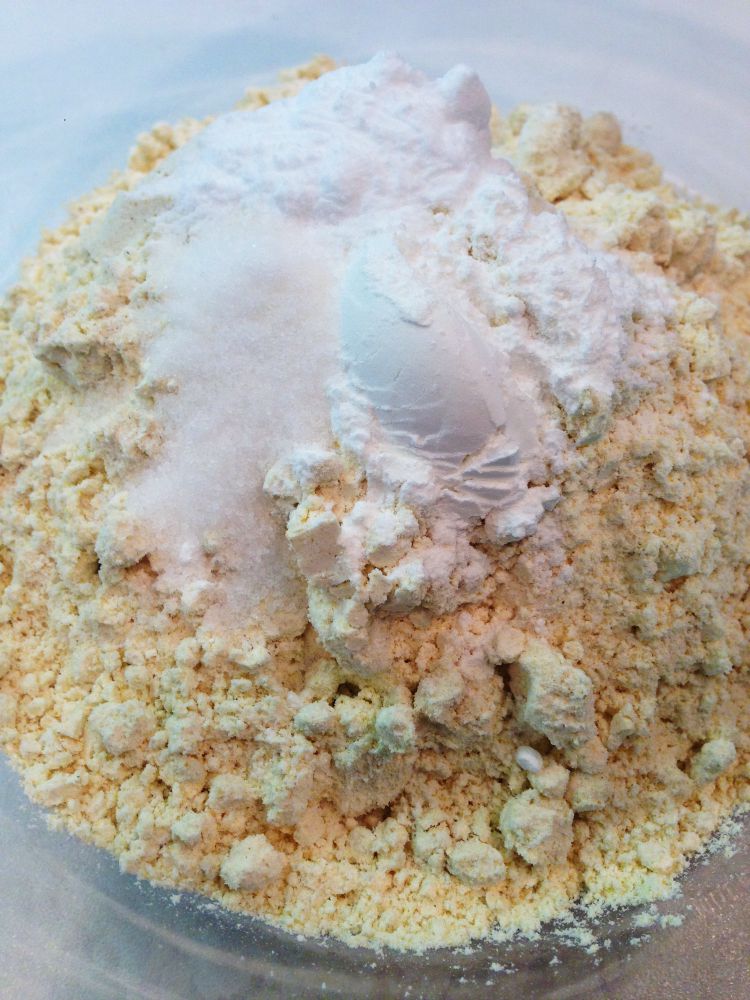- Combine dry ingredients in medium mixing bowl: flour, baking soda, baking powder, and salt.