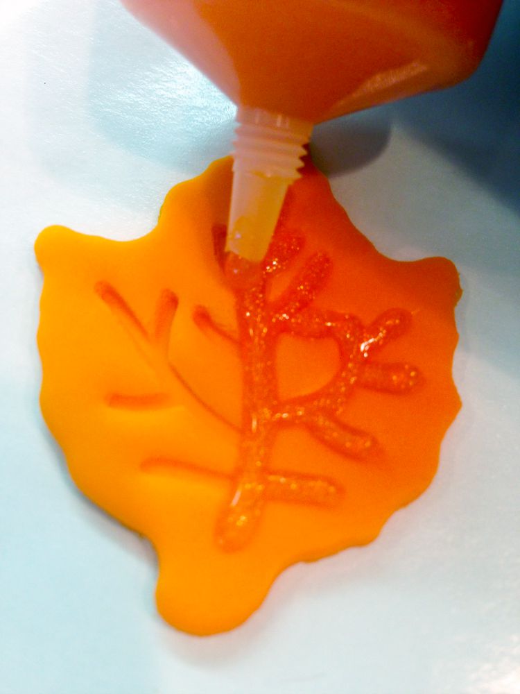 - Using the orange sparkle gel, begin to fill the indentations. Do this to about half of the sugar cookies. Add fondant leaf cutouts to each cookie and press down gently to secure.