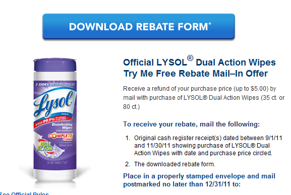 FREE Lysol Dual Action Wipes! October 9, 2011 by Steph Leave a Comment Right now you can score a FREE Lysol Dual Action Wipes via rebate!
