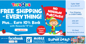 Toys R Us is currently offering FREE SHIPPING, AND you can score 1% Cash Back through Ebates right now!! PLUS you can earn 10% Cash Back with Rewards R US from their Company!!! I’m not sure if it applies to online shopping, but they were advertising a $10 Gift Card for every $75 you spend!!!