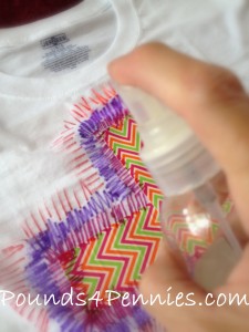 After you have created your design then the fun part starts. Take a squirt bottle and filled it with rubbing alcohol. I would then recommend taking this outside. Liberally spray the front of the shirt with alcohol. The colors will bleed as soon as you start to spray. We found red, orange and black run the best.