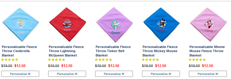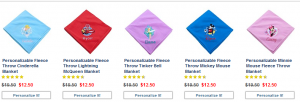Today at the Disney Store you can score 10% Cash Back through ShopAtHome.com, that means you can get the personalized throws that are on sale for $11.25!!!!