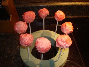 5. Place cake balls with sticks into the refrigerator, and allow to cool for about 2 hours. Before you are ready to dip them, I stick mine into the freezer for about 10-15 minutes.