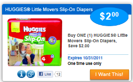 There is a high value coupon for Huggies Little Movers Slip-On Diapers at SavingStarright now! You have to “Add” This to your account!
