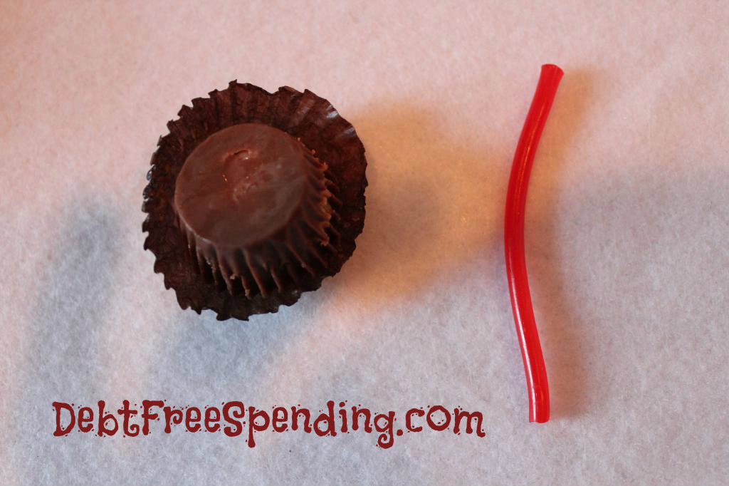 1. Cut the lace licorice about 1 1/2 inch. Gently push both ends into the smaller end of the Reese’s Peanut Butter Cup. This was tough to do without breaking the cup apart, so we had a lot of fun eating our mistakes!