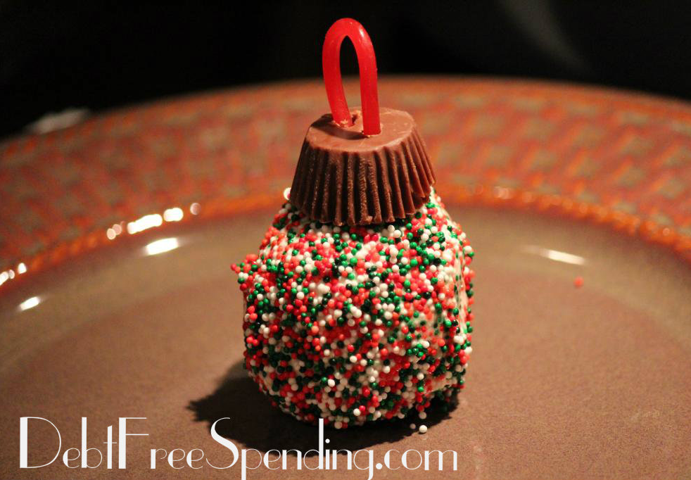 Once you’ve rolled it completely in jimmies, place your Reese’s “ornament hook” on top and DIG IN!!!