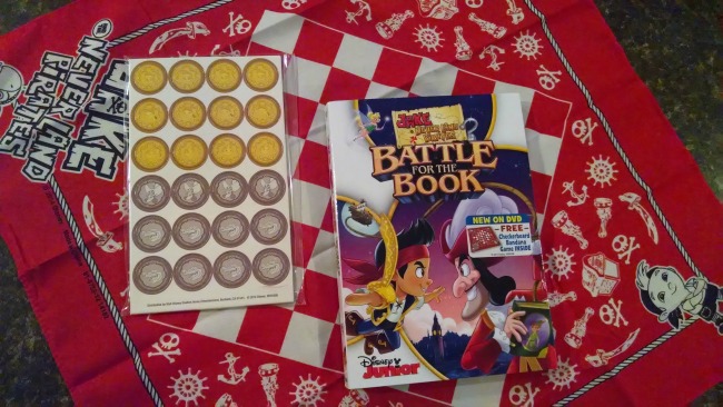 On the DVD’s main menu there are ten short episodes of Jake’s Never Land Pirate School Cartoon Shorts. This is very educational for the little ones! My kids loved them! My favorite “extra” of all has to be the red and white, Jake and the Never Land Pirates checkerboard bandana that came inside the DVD case. There are also, printed cardboard “punch-out” checkers game pieces, to play with!! You can use these as “Gold coins” too!