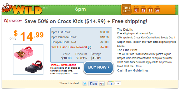 Right now you can score kids Crocs for 50% off from the store 6PM! The website price is $16.99, but the WILD Cash Back deal from ShopAtHome.com is $2.00, so you will net these for $14.99 SHIPPED! Plus, if you’re new to SAH, you’ll score your $5 credit!
