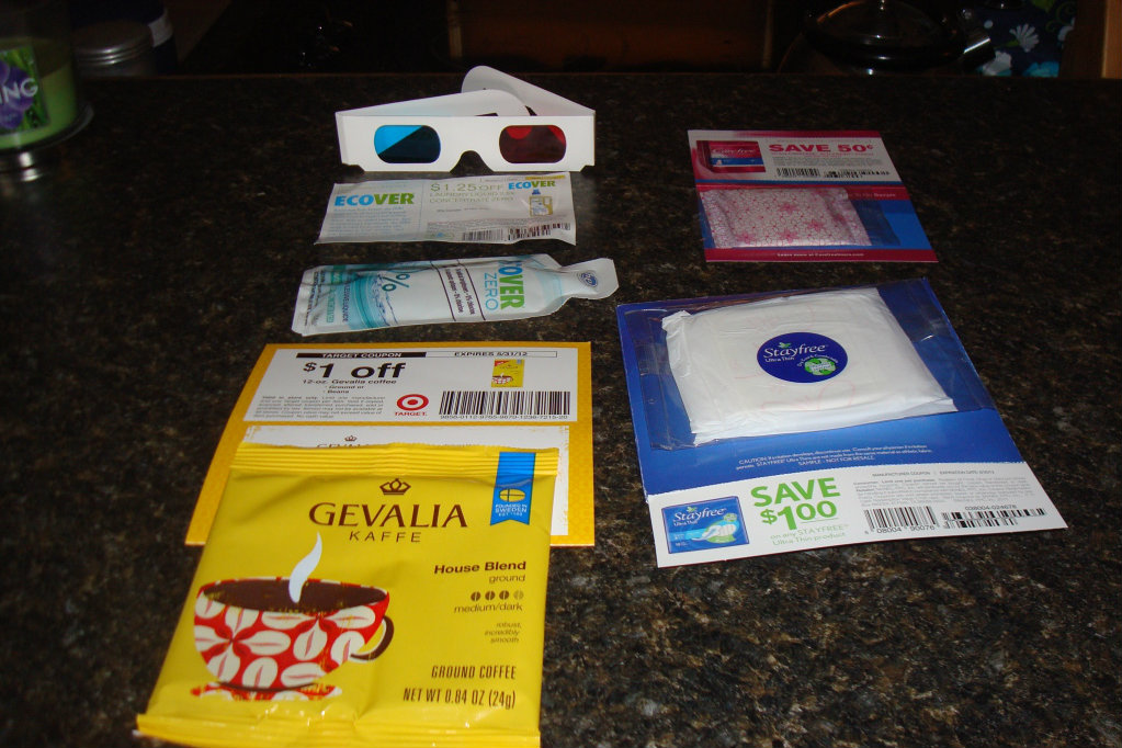 See all the freebies that came in my mail this week!! Hubby was so excited about the Gavlia coffee, but I was happy about the Stayfree coupon. Rite Aid puts these on sale all the time, and I can score them for $0.25 each usually and donate them to our Toiletry Bank!!! I thought our son would like the 3D glasse, and the Ecover detergent will definitely come in handy!!!!! What was in your mailbox???