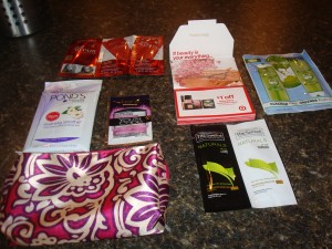 I’m so excited, because my beauty pack from Target came today! It has a TON of Samples, the FREE Make-up bag, AND a WHOLE pacet of Target Web Coupons that can be STACKED with Manufacturer’s Coupons! Remember, the whole point of the freebie is to get the sample!