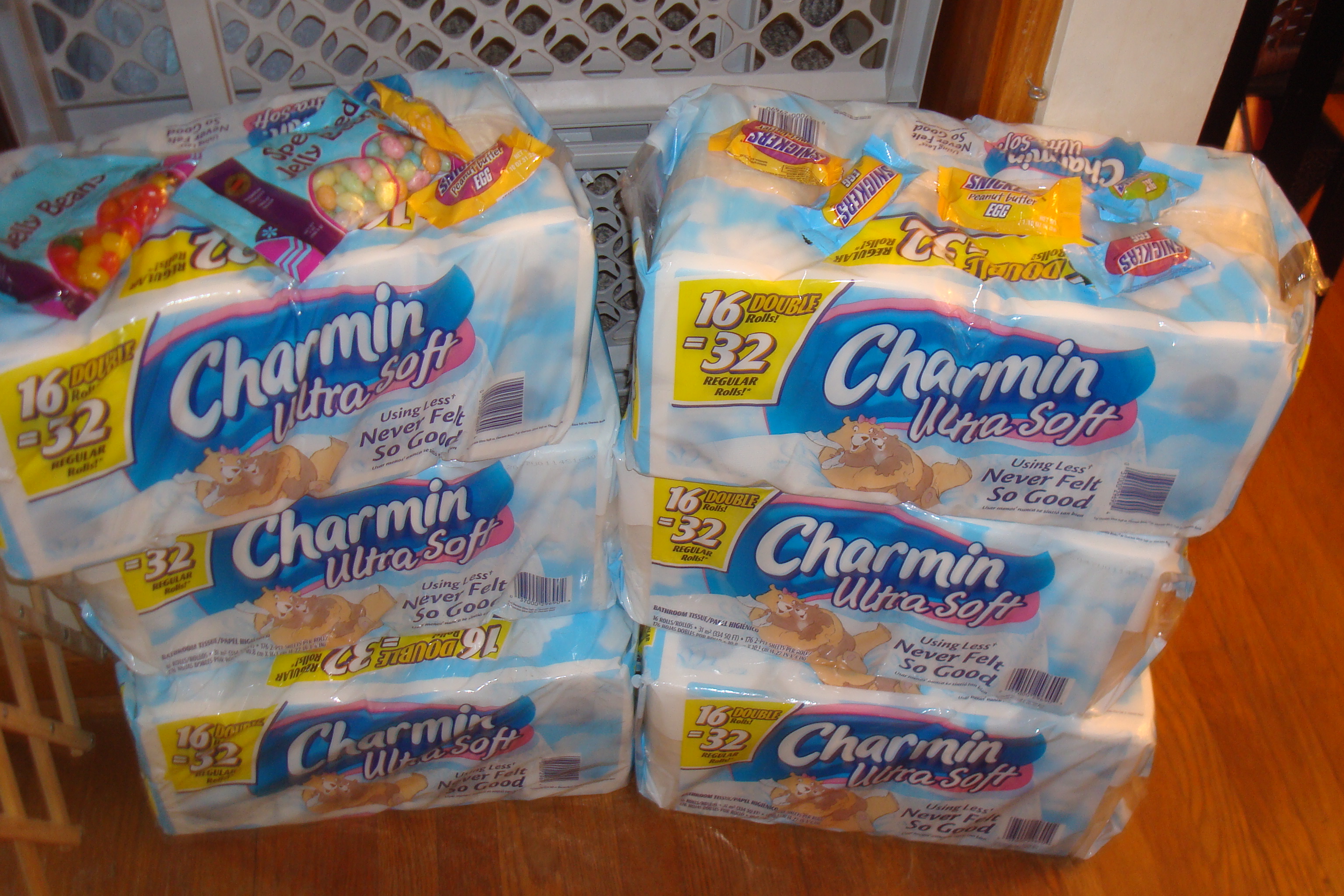 Let’s just say there will be NO toilet paper shortage in my house for awhile! LOL Today I went in with $5.99 in ECB’s and the Magic Coupon Machine printed out a $5.00 off ECB from Beauty Purchases. I started out by rolling cash into the candy and jelly beans, and had (2) $1.00/2 Charmin Coupon. Plus, I used my mom’s card to double the deal, and walked out with $20 in ECB’s. So, my net cost was $20.01 for ALL of this! I was so excited! They haven’t done the ECB deal on Charmin for a WHILE, and I literally was down to my last pack! LOL I just price checked the Charmin at Walmart Friday night, and they were $14 each, which means my bill for all this would have been $96 OOP!!!