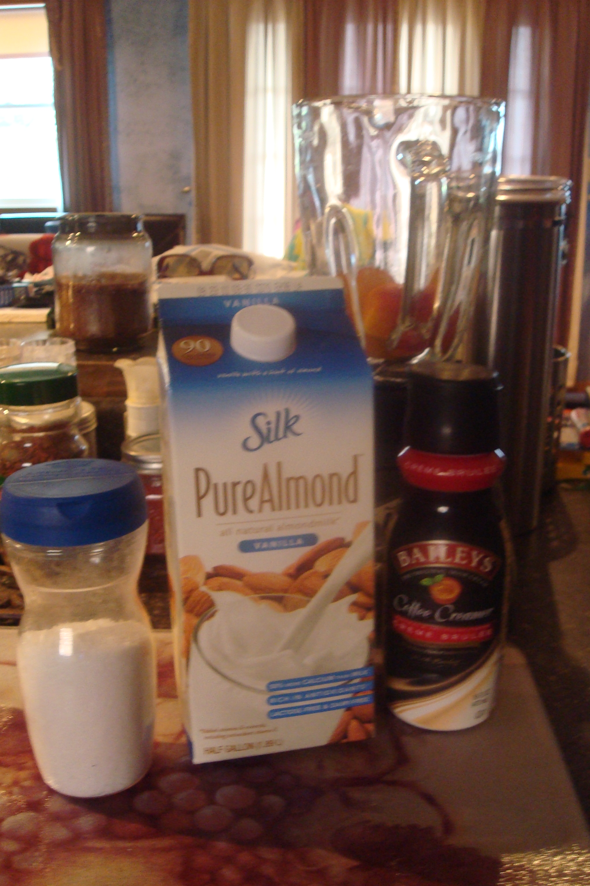 Since I do not drink milk, I use about 1 Cup of Silk Almond Milk, and about 2-3 Tablespoons of whatever creamer I have on hand. I have to admit, the Bailey’s Irish Cream is the BEST!!! Then, I add some Splenda to taste. Finally, I throw in 3-4 traditional sized (you know, in the tray;) ice cubes. I LOVE my glass blender – if you make a lot of these types of drinks, it pays to splurge!