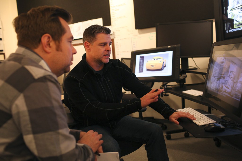 Brian Fee and Scott Morse review a Cars 3 story sequence on December 15, 2016 at Pixar Animation Studios in Emeryville, Calif. (Photo by Deborah Coleman / Pixar)