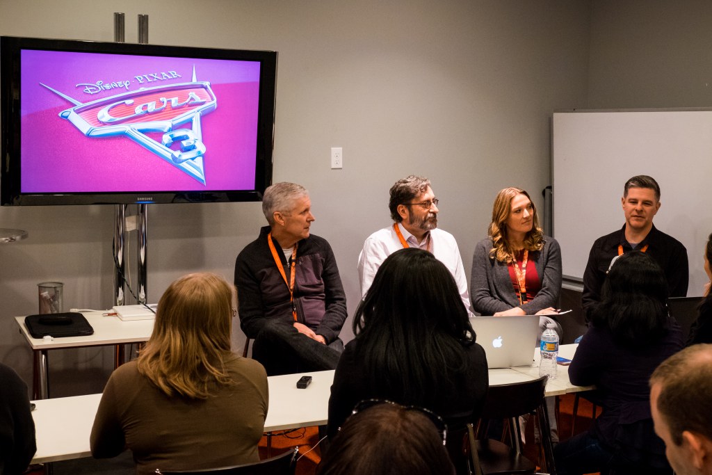 The “Cars 3” Long Lead Press Days, held at Sonoma Raceway, including presentations by the “Cars 3” writers (left to right) Mike Rich, Bob Peterson and Kiel Murray and Story Supervisor Scott Morse, held on March 28, 2017 in Sonoma, Calif. (Photo by Marc Flores)