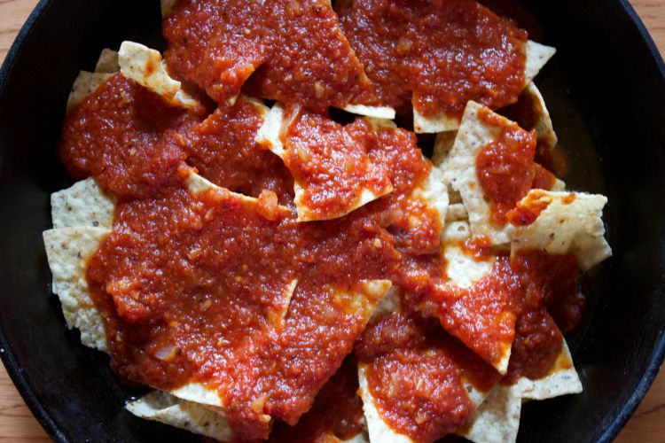 - Cover and coat the tortilla chips with the tomato sauce.