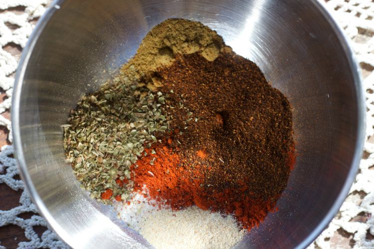 - Combine seasonings (salt, pepper, smoked paprika, cumin, chipotle chili powder, oregano and garlic powder) together in a bowl and mix.