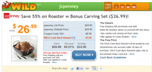 Right now you can score a Roaster W/ Bonus Carving Set for $26.99 from JC Penney through ShopAtHome.com! The web price is $29.99, and the WILD Cash Back Deal is $3.00!! This makes your net cost $26.99! There is FREE shipping on orders over $69, so while you’re there, look around for other Christmas Gifts! If you’re new, you’ll score your $5 credit, and make this net price $21.99!