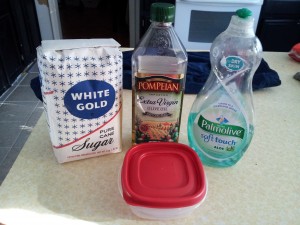 2. Add 2-3 Tbl. of olive oil and 1/3 c. dish liquid and essential oil.