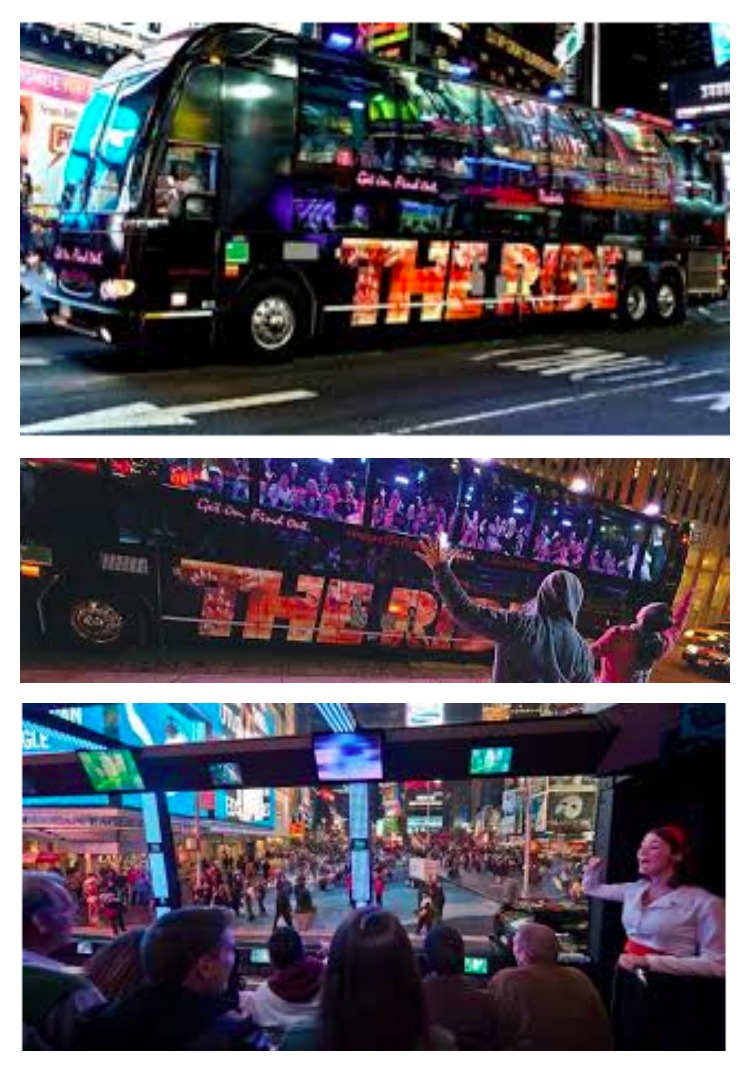 THE RIDE gives you a front-row seat to the streets of New York City in a multi-million dollar motor coach that comes equipped with state-of-the-art audio/visual technology, including 40 plasma screen TVs and over 3000 LED lights. Enjoy the performance from the comfort of one-of-a-kind stadium seating and huge panoramic windows.