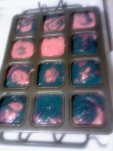 - Divide the frosting into bowls for the number of colors you plan to use (I only did three this time because once again my frosting was pink)