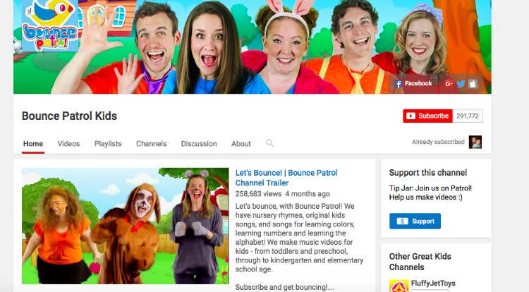 - Bounce Patrol Kids. This is by far my son’s favorite and our favorite as well. We know all the songs by heart, and even our ten-year-old has been caught singing them around the house.