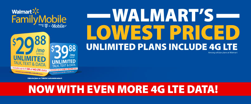 Looking for an unlimited wireless plan at an amazingly low price? Walmart Family Mobile has the perfect deal for you, now with more 4G LTE data! $29.88/month (+taxes/fees) gets you Walmart’s Lowest Priced Unlimited Plan which includes Unlimited Talk, Text, & Data with up to 1 GB at 4G LTE Data Speeds. This allows you to do even more without paying more.