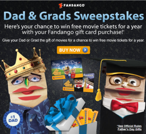 Give Dad and Grads the gift of movies for a chance to win free movie tickets for a year. Just make a Fandango purchase HERE, and you will be entered into a sweepstakes where you could win FREE movie tickets for a year!!